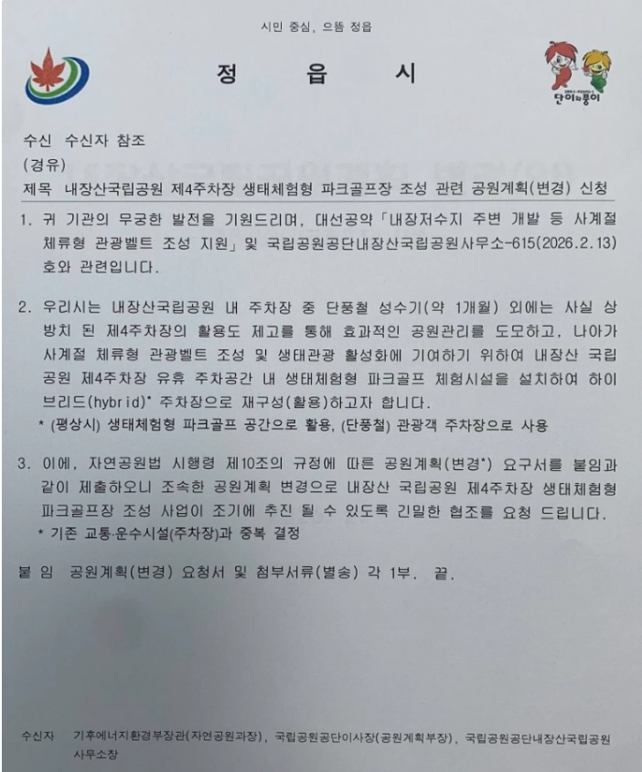 내장산 국립공원 관리계획 변경(주차장*파크골프장 중복 결정)안의